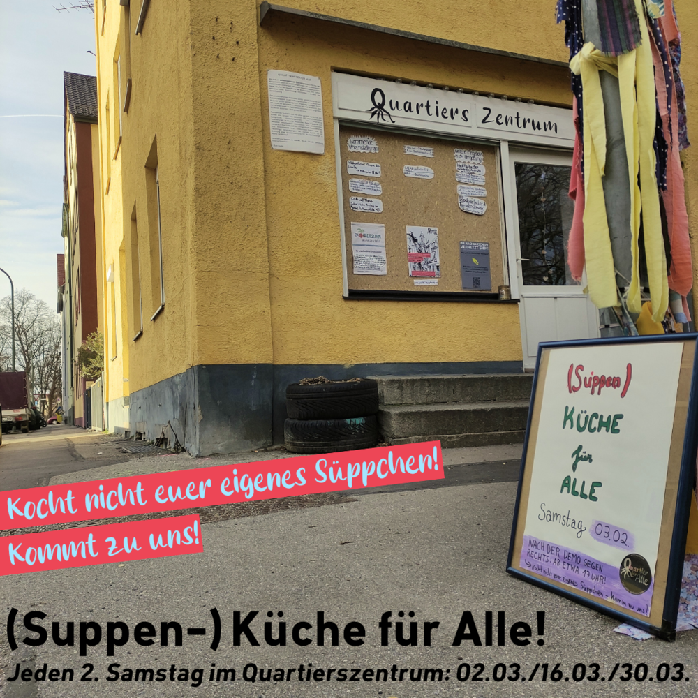 Am kommenden Samstag startet die nächste (Suppen-) Küche für Alle im Quartierszentrum. Nach der Demo gegen Rechts (www.augsburg-gegen-rechts.de) treffen wir uns voraussichtlich gegen 17 Uhr auf der Ecke Mittelstraße/Wiesenstraße und lassen den Samstag antifaschistisch ausklingen. Wir freuen uns auf Dich!