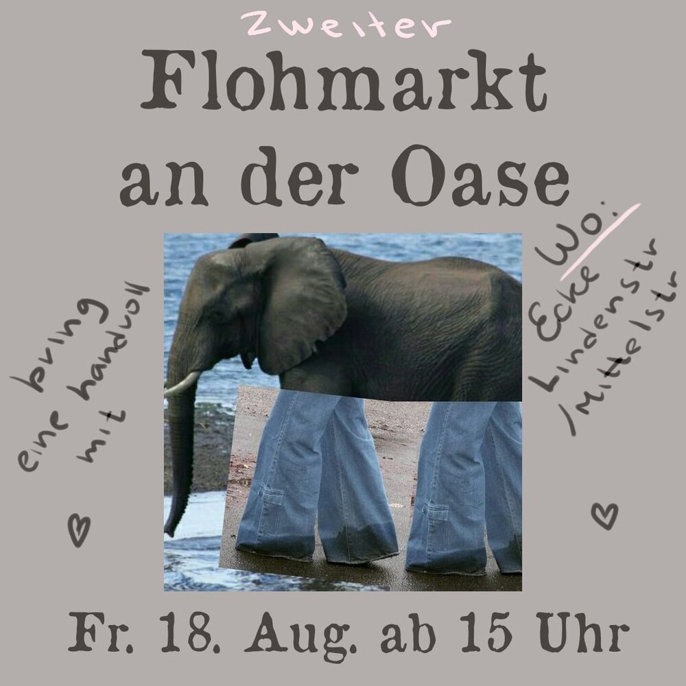 Freitag, der 18. August - 2. Flohmarkt (mit Upcycling-Workshop) - 15:00 bis 20:00 Uhr Wir verwandeln die Ecke Mittelstraße/Lindenstraße in eine Flohmarkt-Oase mitten in der Stadt. Den ganzen Nachmittag kannst du hier stöbern, tauschen und Dinge ergattern. Wenn Du Lust hast selbst etwas auf Spendenbasis anzubieten, komm auf uns zu! Neben dem Flohmarkt auf Spendenbasis wird es einige Nähmaschinen geben mit Menschen, die dir zeigen, wie Du kaputte Klamotten wieder auf Vordermensch bringst oder verschönerst. Bring also mit, was Du gestalten willst.