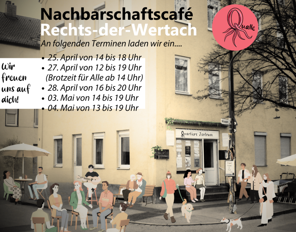 The first "opening hours" for the non-commercial Neighborhood Café in Rechts-der-Wertach. The exact location is the neighborhood center at the corner of Wiesenstraße/Mittelstraße. On the following dates, you can come by, meet people from the neighborhood and beyond, connect and exchange, or simply have a good time: