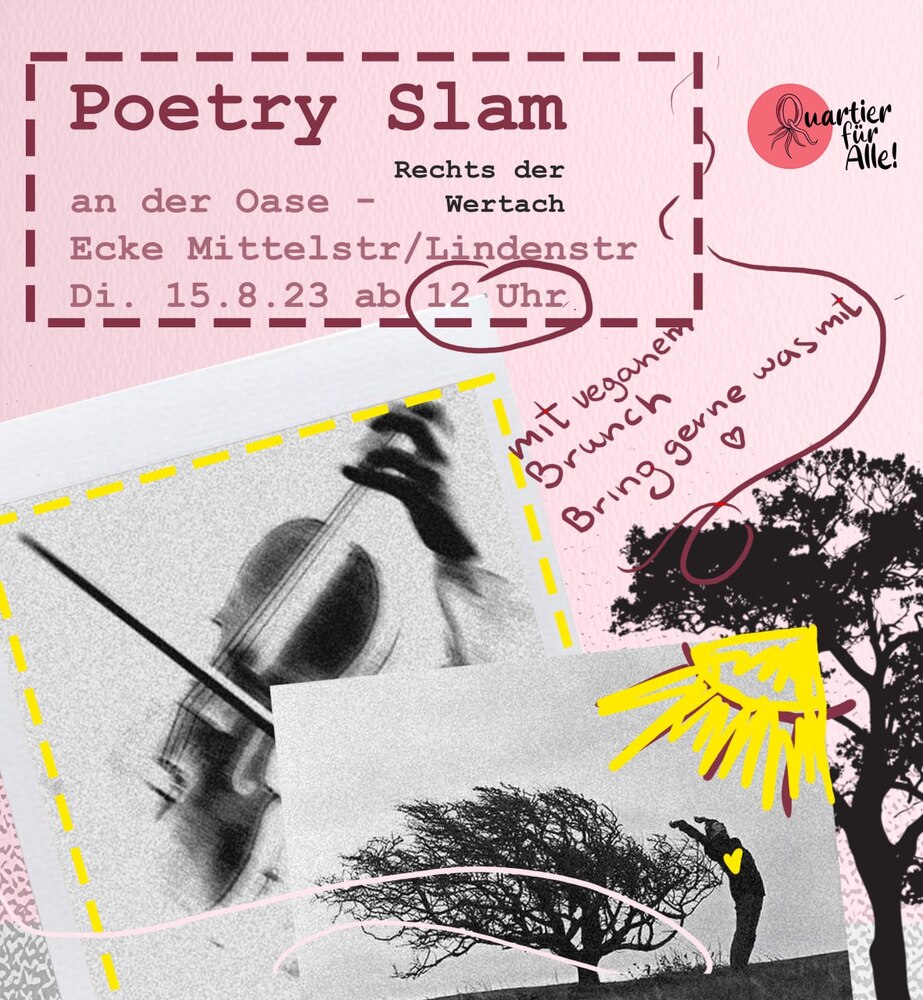 Dienstag, der 15. August - Veganer Brunch & Poetry-Slam - 12:00 bis 17:00 Uhr Bring' einen veganen Salat, Snacks oder Sonstiges mit. Dazu tauschen wir uns aus und lauschen poetischen Gedichten und Texten, die gerne gesellschaftskritisch sein dürfen! Wenn Du also selbst etwas vortragen möchtest, schreibe uns gerne eine Mail.